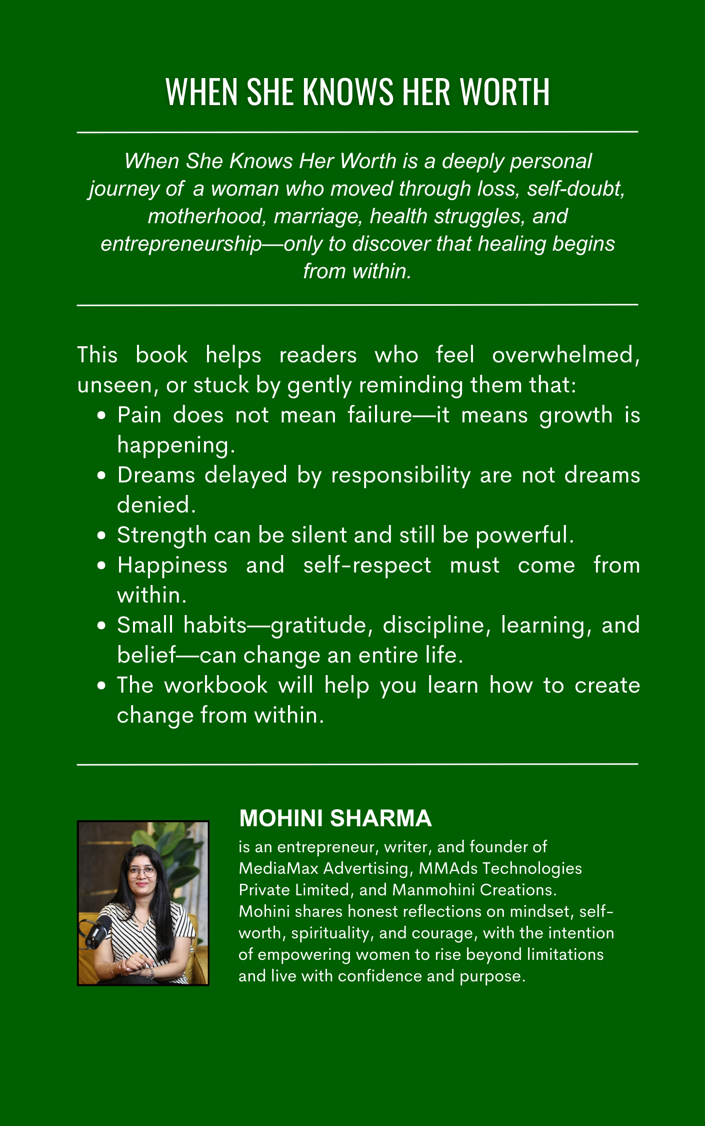 When She Knows Her Worth is a deeply personal and reflective journey of a woman who has moved through loss, self-doubt, motherhood, marriage, health struggles, and entrepreneurship—only to discover that true healing and strength begin from within.